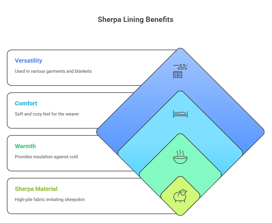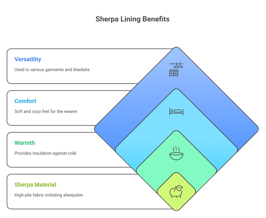 Sherpa-lined is a term that is often heard in the fashion world that points to the use of Sherpa material in the inner layer of the cloth, which is a premium and high-pile fabric that imitates the appearance and texture of real sheepskin wool. Besides, Sherpa lining serves to provide warmth, insulation, and comfort to the wearer, making it feel like the regular jacket or blanket has transformed into one soft and warm cloud.