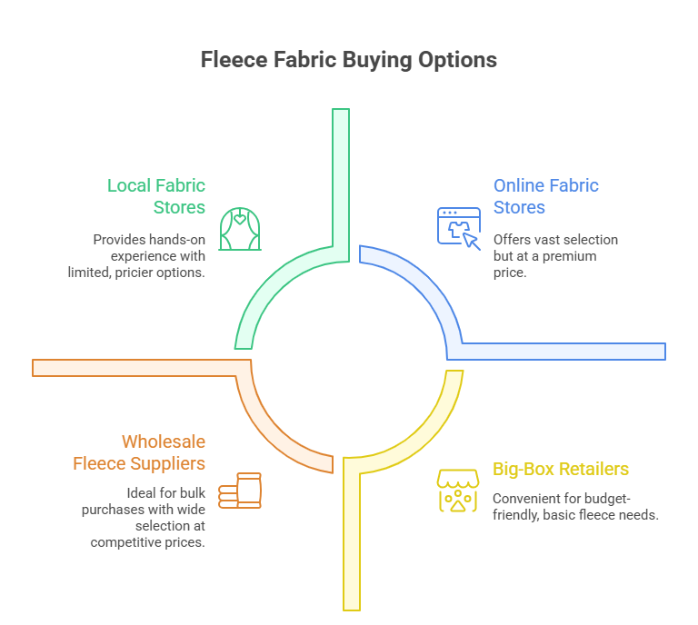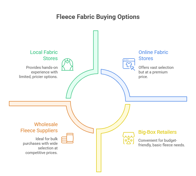 Some people enjoy the hands-on experience of visiting local stores, while others prefer online shopping at midnight with a cup of tea (just remember to check the yardage unless you want a “mystery-sized project”). Thankfully, today there are multiple great places where you can buy fleece fabric depending on your needs, budget, and project type.