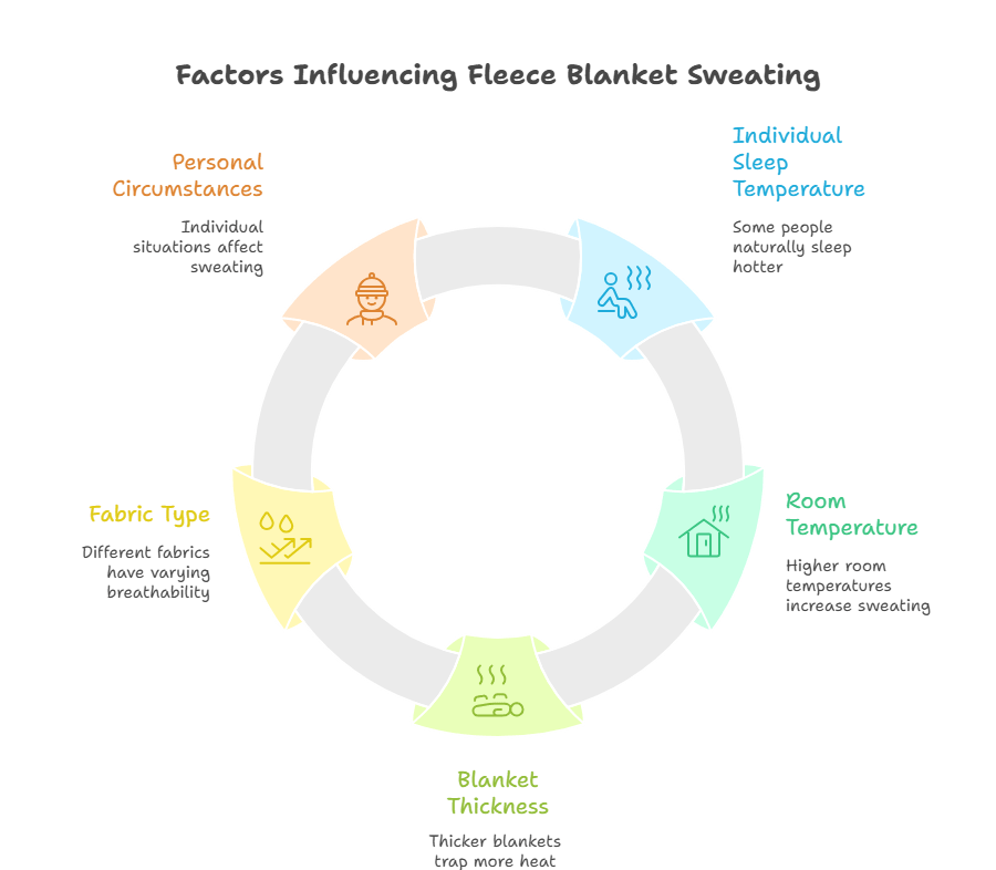 In addition, room temperature is a big influencer in one’s life. In rooms, if there is a furnace and the heat is on, and you bring in some wonderful heavy fleece, you will go from snuggling warm to just plain too warm. Hence, how much or if a fleece blanket induces sweating is mostly a function of the person and their circumstances.