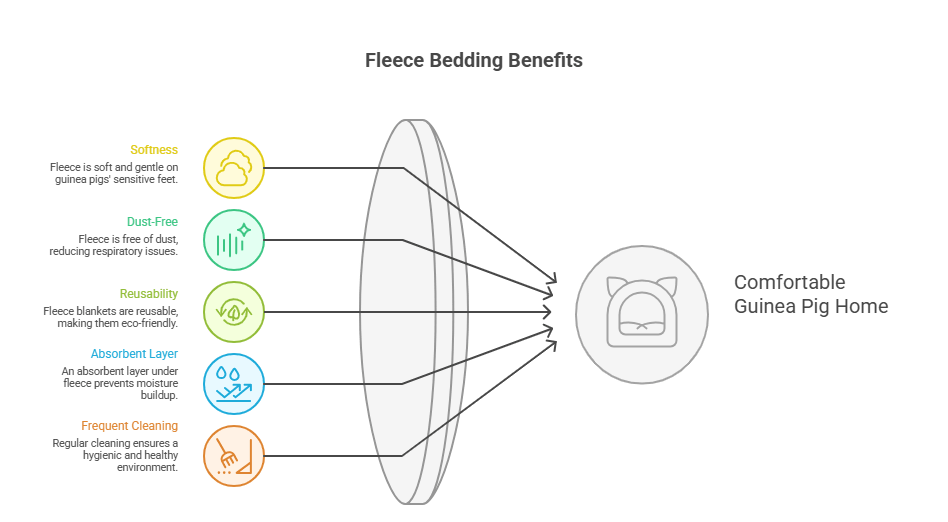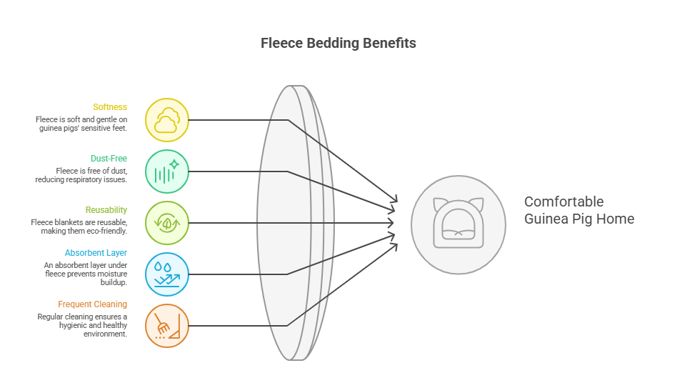 Fleece bedding usually means a fleece blanket or liner placed on top of an absorbent layer. The fleece itself does not hold moisture. Instead, it allows urine to pass through to the layer underneath, keeping the surface dry for your guinea pig’s feet and belly.