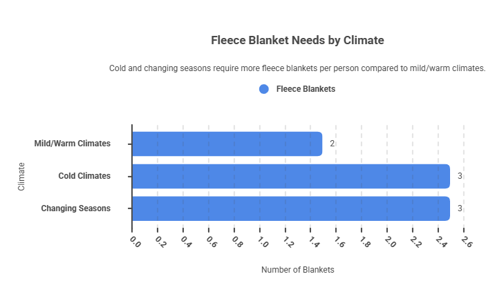 In mild or warm climates, a fleece blanket may well be used for comfort only and not for self-preservation. More often or not, breezy evenings are spent indoors in air-conditioned buildings, and it is another high spot to become indoors. Under such conditions, one or two fleece blankets for every person should be found adequate; the others certainly are a personal preference and not at all a requirement.