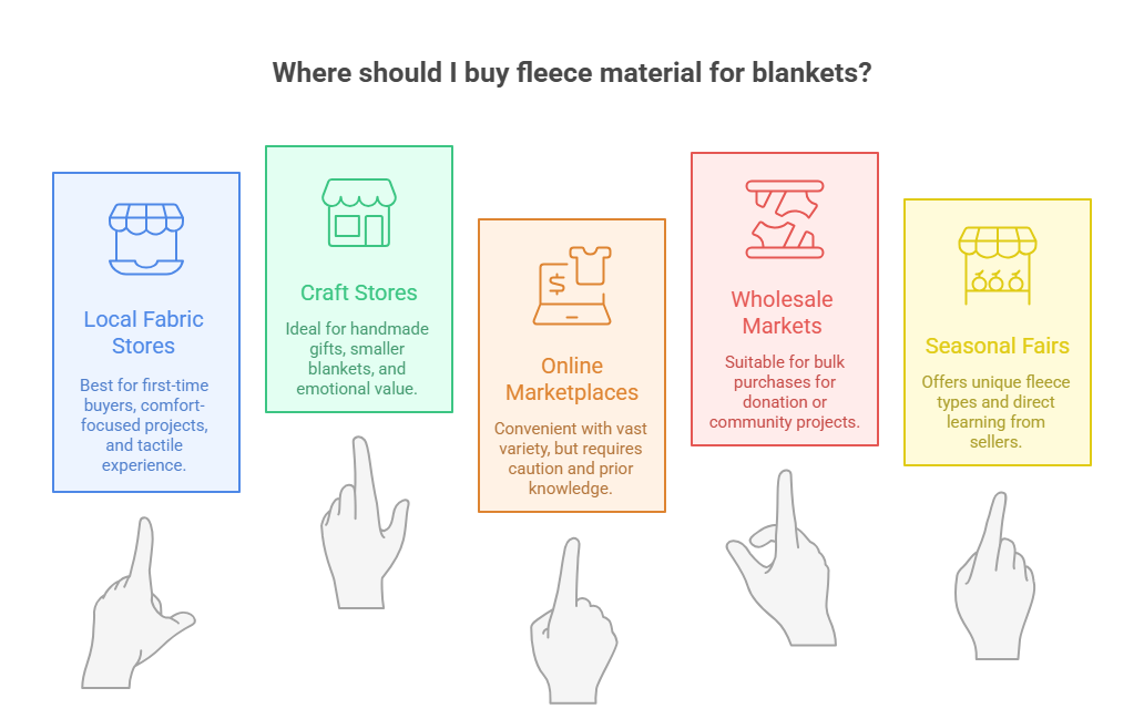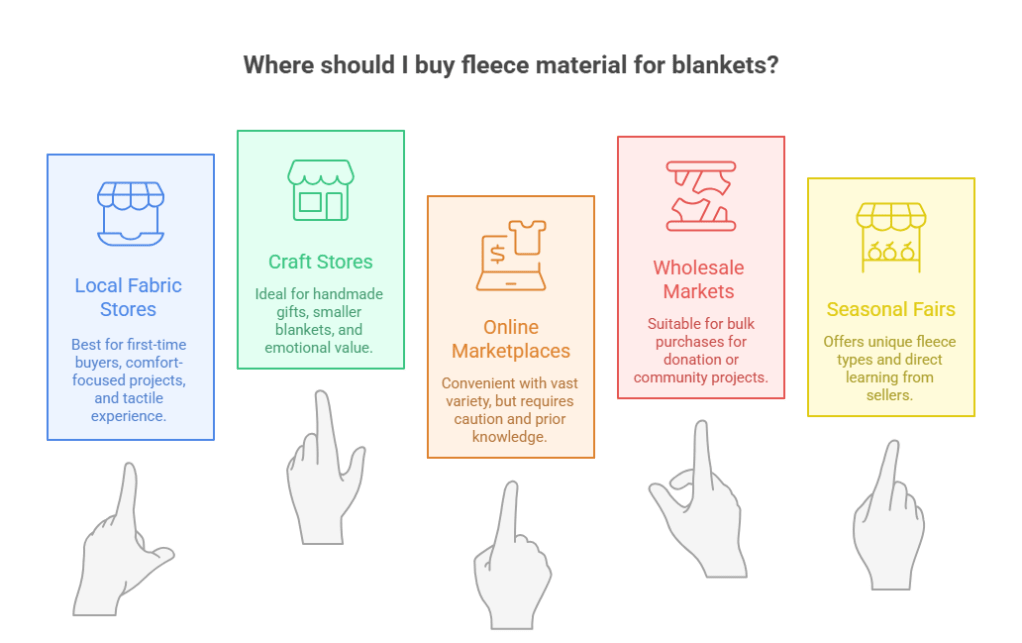 If you are questioning yourself about purchasing fleece material for making blankets, local fabric stores, craft and DIY shops, online fabric marketplaces, wholesale fabric markets, and seasonal fabric fairs are the best options almost always. The proper place is determined less by shopping location and more by the reason for the fleece purchase.